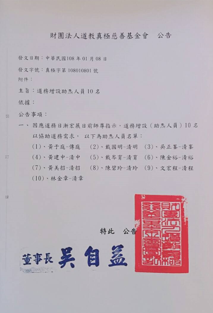 一、 因應道務日漸宏展日前師尊指示,道務增設(助炁人員)10名以協助道務需求, 以下為助炁人員名單: