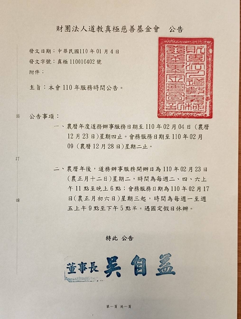 一、農曆年度道務辦事服務日期至110年02月04日 (農曆12月23日)星期四止。