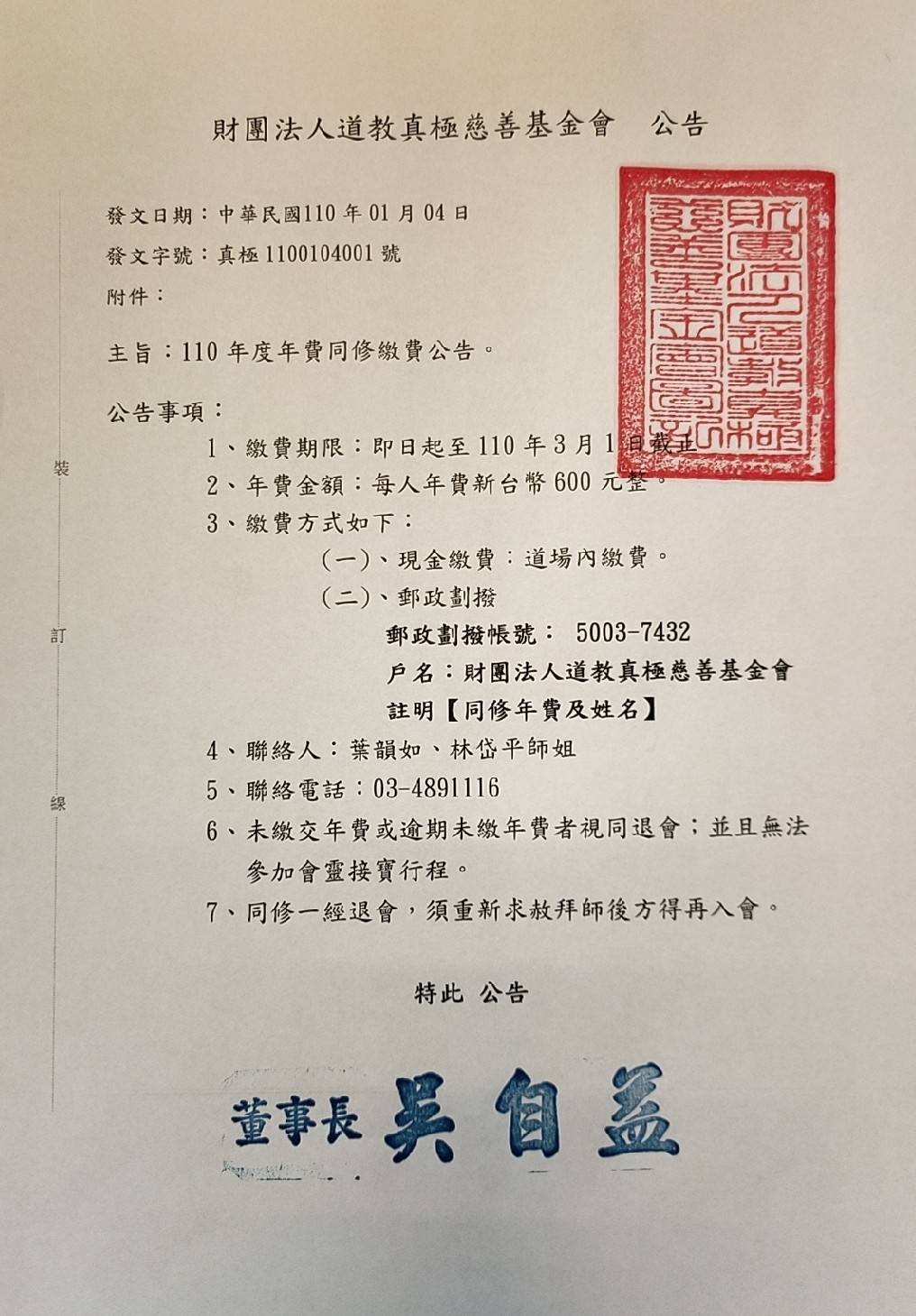 戶名:財團法人道教真極慈善基金會註明【同修年費及姓名】