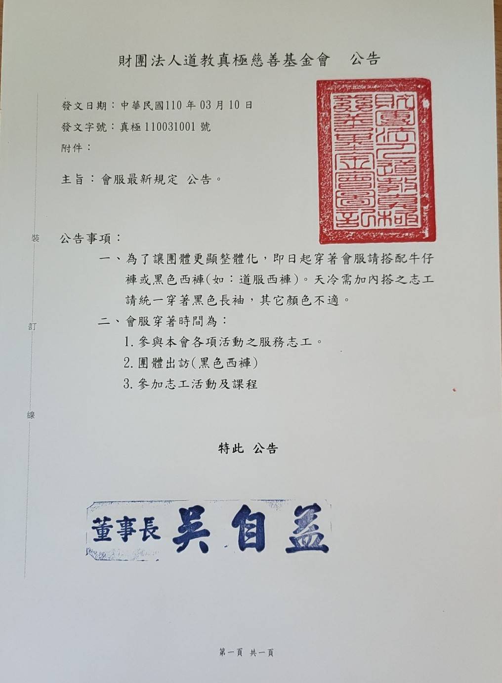 一、為了讓團體更顯整體化,即日起穿著會服請搭配牛仔褲或黑色西褲(如:道服西褲)。天冷需加內搭之志工請統一穿著黑色長袖,其它顏色不適。
