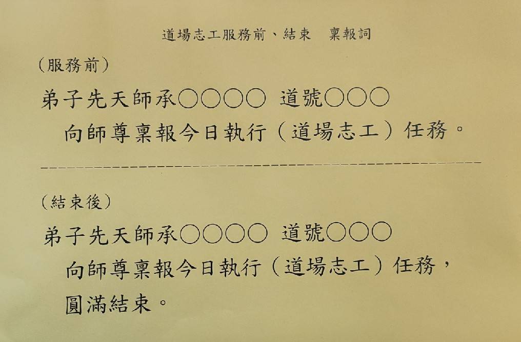 (限本會室內活動)工作前需向三清道祖稟報當日職務內容。任務完成後,應稟報職務圓滿完成。藉以明確服務職責。