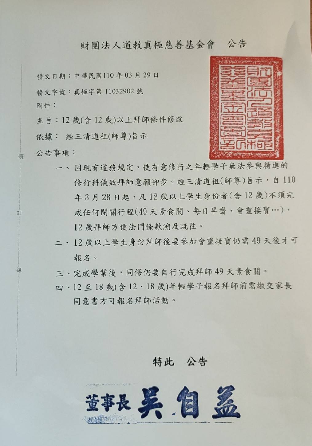 凡12歲以上學生身份者(含12歲)不須完成任何閉關行程(49天素食關、每日早齋、會靈接寶…),12歲拜師方便法門條款溯及既往。