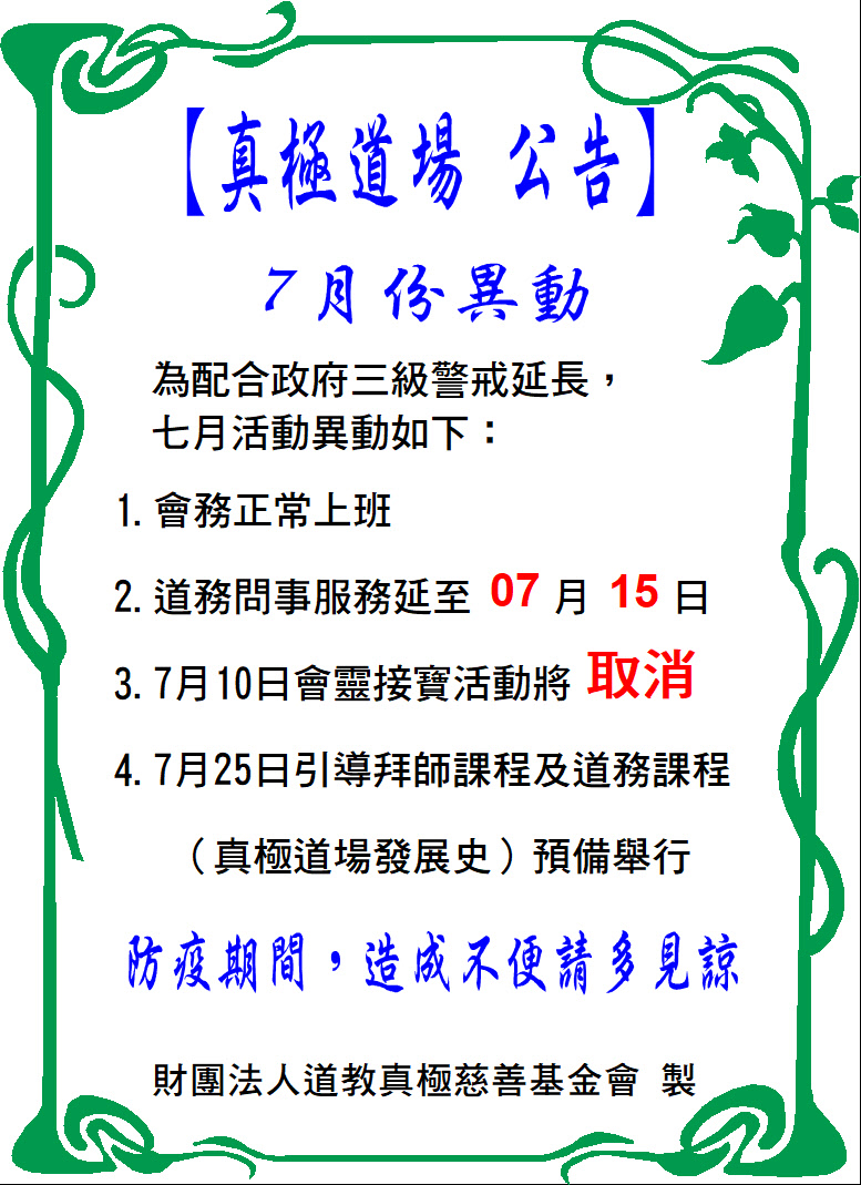 1.會務正常上班2.道務問事服務延至7月 日3.7月10日會靈接寶活動將"取消"4.7月25日引導拜師課程及道務課程(真極道場發展史)預備舉行防疫期間,造成不便請多見諒