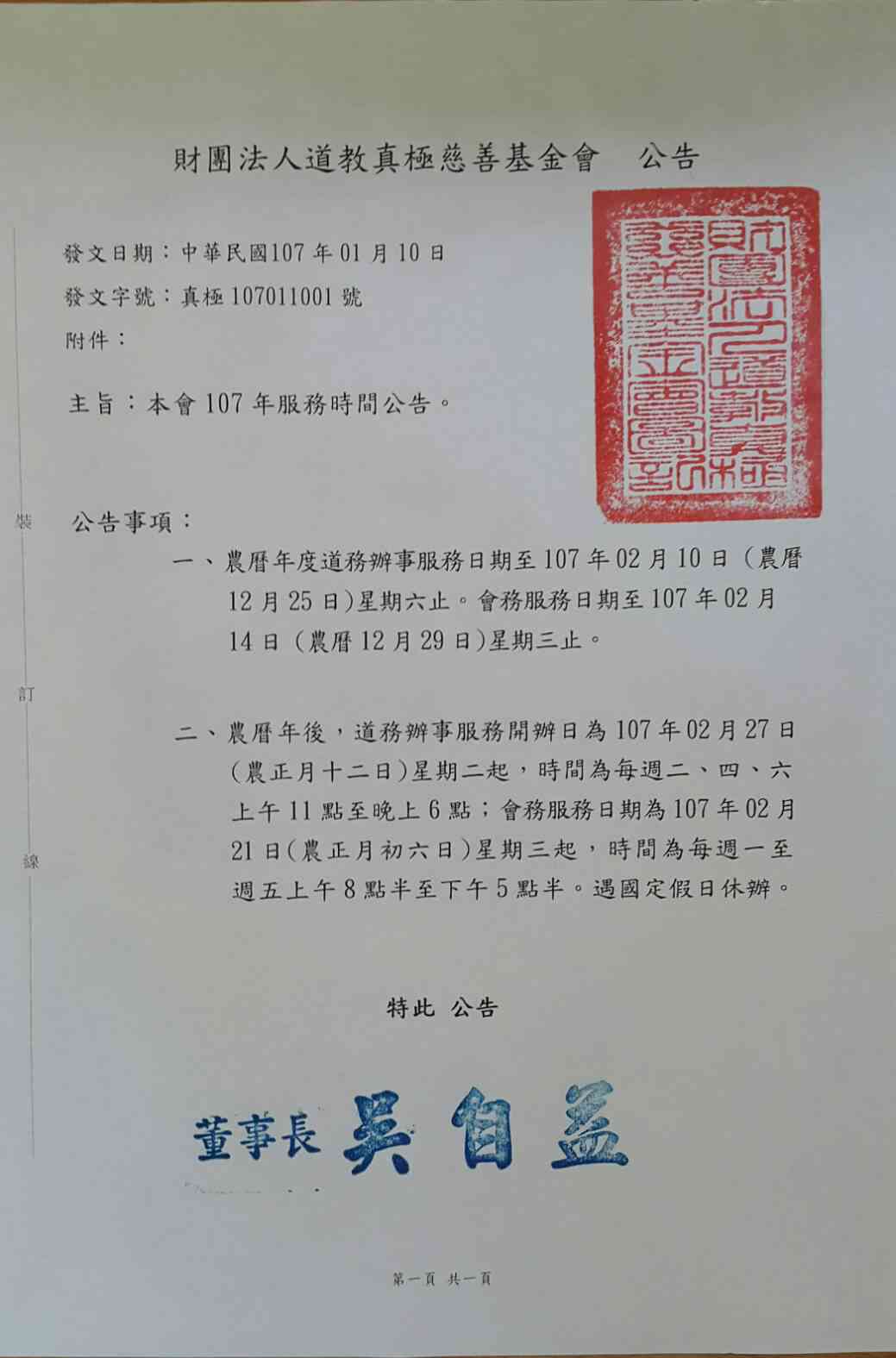 一、農曆年度道務辦事服務日期至107年02月10日 (農曆12月25日)星期六止。會務服務日期至107年02月14日 (農曆12月29日)星期三止。