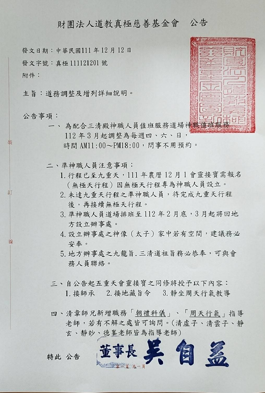 3. 準神職人員道場排班至112年2月底,3月起將回地方設立辦事處。