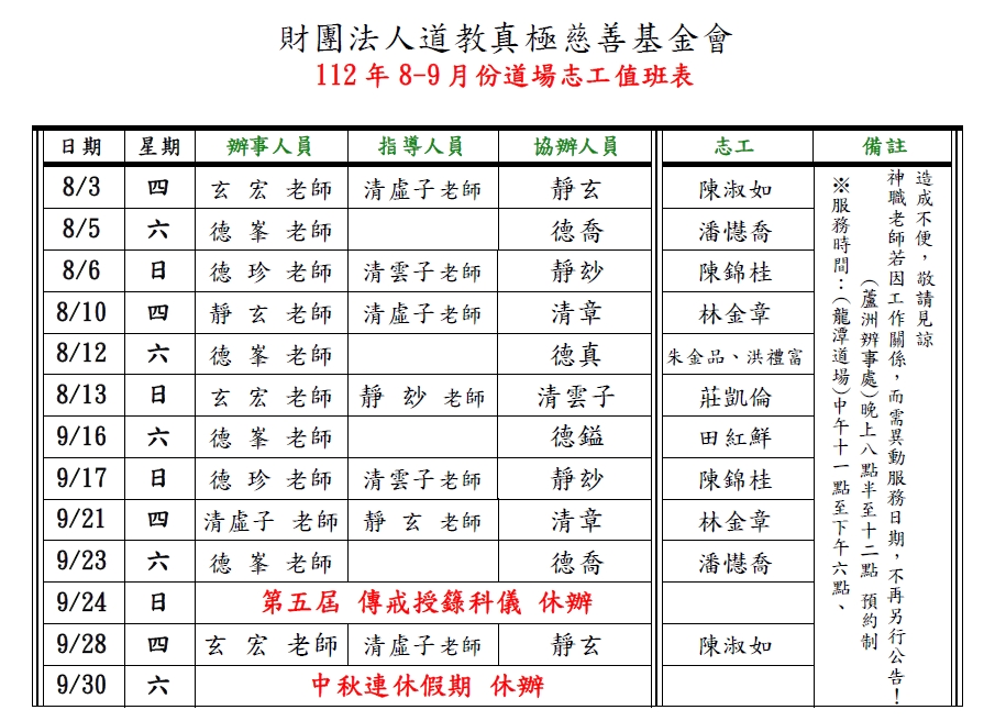 二、每次辦事日接受10位預約掛號,請掛號者告知會務人員所需之日期、問事者姓名、問事人數及聯絡電話。當您指定之日期已經額滿,會務人員將安排您下一個最接近的問事日期,經與掛號者確認後,將排入預約掛號登記表並告知您正確的掛號問事日期及掛號順序(號碼)、問事時間。