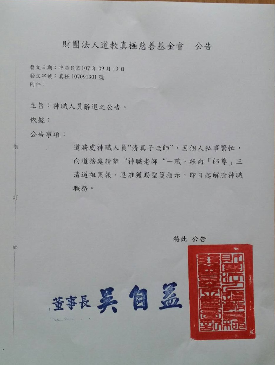 道務處神職人員”清真子老師”,因個人私事繁忙,向道務處請辭“神職老師“一職,經向「師尊」三清道祖稟報,恩准獲賜聖筊指示,即日起解除神職職務。