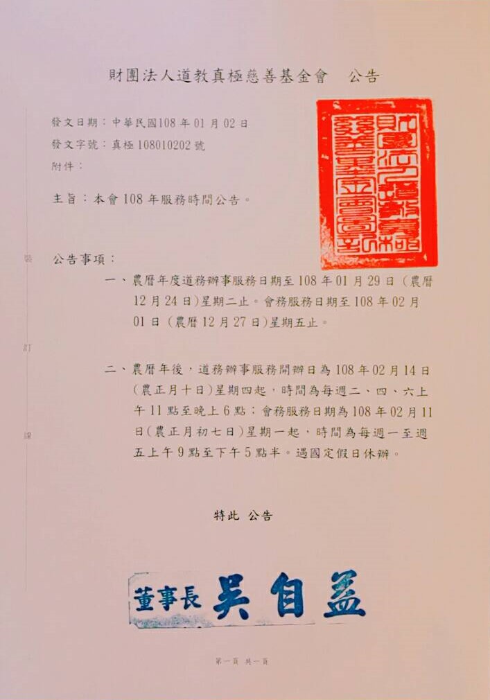 一、農曆年度道務辦事服務日期至108年01月29日 (農曆12月24日)星期二止。會務服務日期至108年02月01日 (農曆12月27日)星期五止。