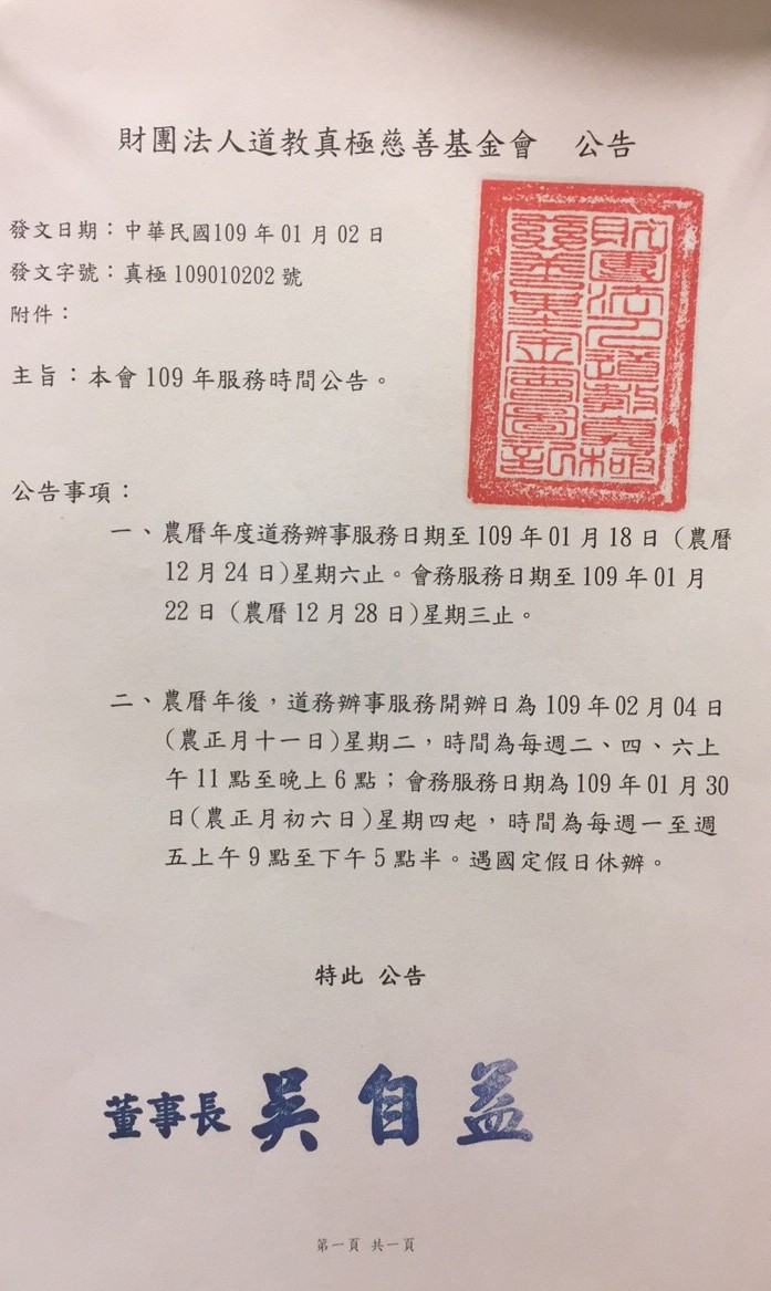 一、農曆年度道務辦事服務日期至109年01月18日 (農曆12月24日)星期六止。會務服務日期至109年01月22日 (農曆12月28日)星期三止。